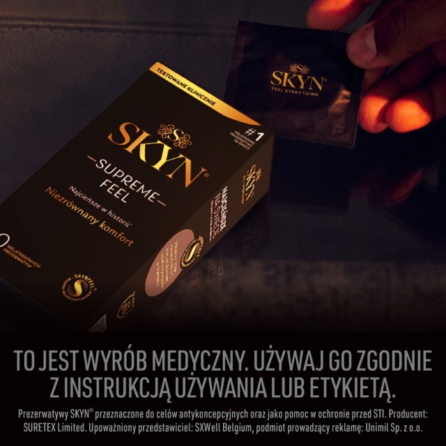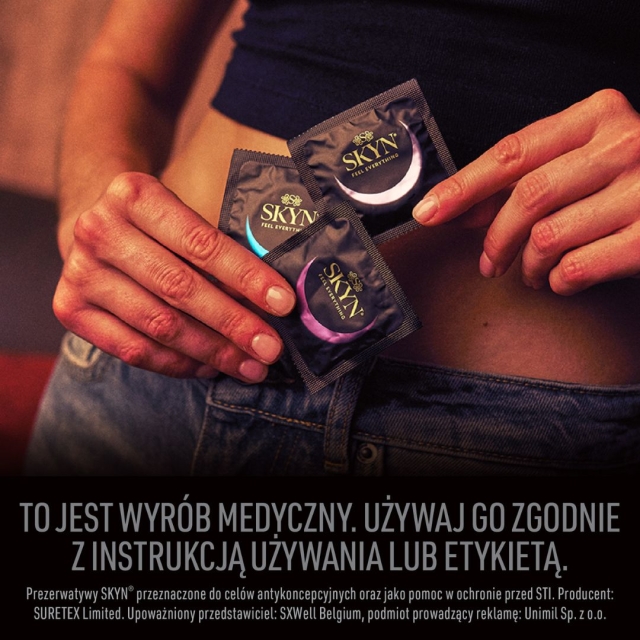 Seks to coś więcej niż przyjemność - to wybór. Dlatego też tworzymy produkty dla tych, którzy wiedzą, czego chcą. Nie tylko w łóżku, ale również w życiu. Marka SKYN® poliizoprenowe prezerwatywy wprowadziła do sprzedaży w 2009 roku. Ze względu na zbliżone doznania do odczuć bez prezerwatywy, zdobyty wielu fanów w kilkudziesięciu krajach na 5 kontynentach. Cieszą się również dużą popularnością w Polsce. Warto podkreślić, że SKYN® to nr 1 wśród nie lateksowych prezerwatyw na świecie, ale nasz asortyment to także żele intymne oraz gadżety.