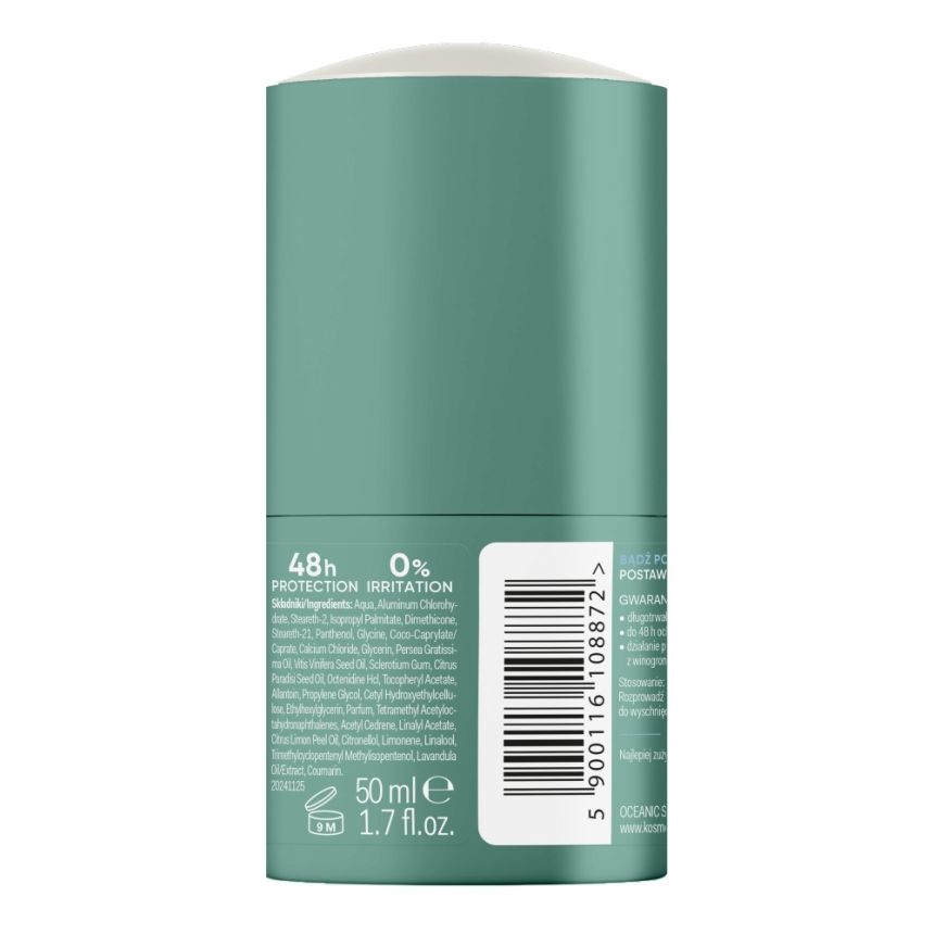 Formuła działa do 48 godzin, zapewniając uczucie suchości i odświeżenia, a dodatkowo pielęgnuje skórę dzięki zawartości oleju z winogron i olejku z grejpfruta, które nawilżają i zmiękczają skórę pod pachami.