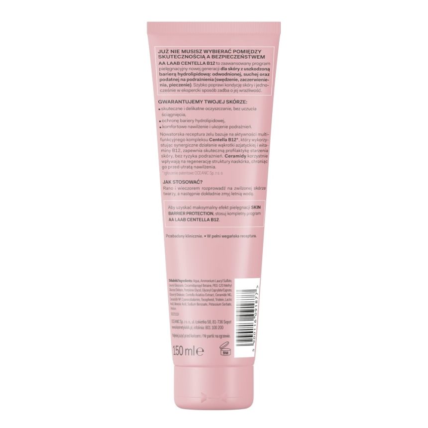 AA LAAB 100% Centella B12 Nawilżający żel do mycia twarzy to kolejny etap pielęgnacji dla skóry z osłabioną barierą hydrolipidową – suchej, odwodnionej i wrażliwej, skłonnej do zaczerwienień i podrażnień. Żel skutecznie oczyszcza skórę, nie powodując uczucia ściągnięcia, a jednocześnie chroni jej naturalną barierę ochronną.