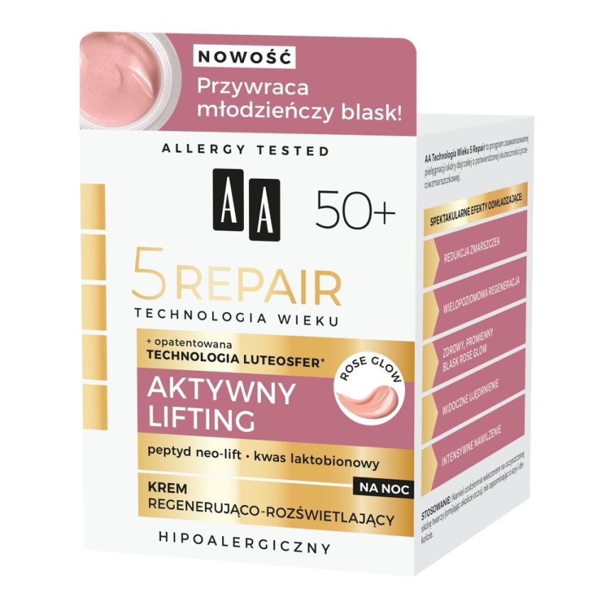 Poznaj AA Technologia Wieku 5Repair 50+ Aktywny Lifting Krem na noc regenerująco-rozświetlający – zaawansowaną pielęgnację stworzoną specjalnie z myślą o potrzebach skóry po 50. roku życia. To nocny krem, który działa wtedy, gdy skóra najintensywniej się regeneruje, wspierając procesy odbudowy i widocznie poprawiając jej wygląd.
