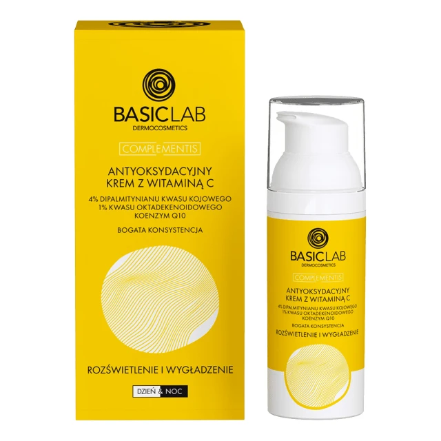 Działanie :Witamina C (Ascorbyl Tetraisopalmitate) – silny antyoksydant o wydłużonym działaniu, który wspomaga syntezę kolagenu, poprawiając jędrność i elastyczność skóry. 4% dipalmitynianu kwasu kojowego – działa synergicznie z witaminą C, redukując widoczność przebarwień, wyrównując koloryt i nadając skórze zdrowy blask. 1% kwasu oktadekenodiowego – skutecznie rozjaśnia plamy pigmentacyjne i zapobiega powstawaniu nowych przebarwień.Koenzym Q10 – silny antyoksydant, który chroni skórę przed stresem oksydacyjnym. Dzięki rozpuszczalności w tłuszczach łatwo przenika do głębszych warstw skóry, poprawiając jej elastyczność, wygładzając drobne zmarszczki i nadając formulacji charakterystyczny żółty kolor. Olej z rokitnika – intensywnie regeneruje i odżywia skórę, a także nadaje kremowi delikatny, naturalny zapach oraz żółty odcień.Witamina E (Tocopherol) – działa w synergii z koenzymem Q10, wspierając regenerację skóry i wzmacniając jej barierę ochronną.