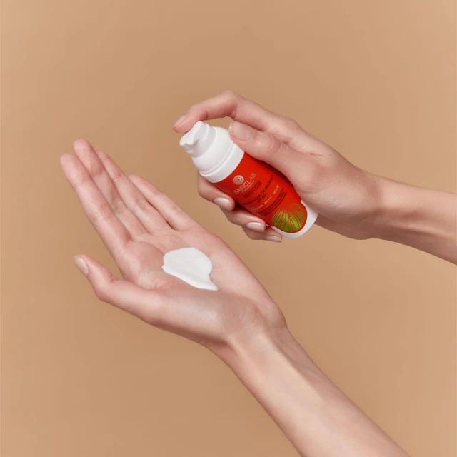 Przed pierwszym użyciem produktu pompka wymaga naciśnięcia około 6-8 razy, zanim wydozuje emulsję. Jedna pełna pompka to około 0, 85 g produktu. Ze względu na płynną konsystencję, zalecamy dozowanie go na wewnętrzną stronę dłoni.