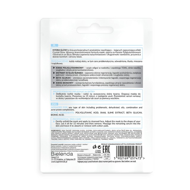 Maska kojąco-nawilżająca z kwasem poliglutaminowym i ekstraktem ze śluzu ślimaka to wyjątkowy produkt, który zapewnia intensywne nawilżenie, ukojenie oraz regenerację skóry. Dzięki starannie dobranym składnikom aktywnym, maska wspomaga poprawę elastyczności, struktury skóry, a także łagodzi podrażnienia, przywracając cerze zdrowy blask i optymalny poziom nawodnienia.