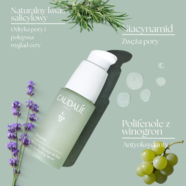 SERUM NA NIEDOSKONAŁOŚCI Z KWASEM SALICYLOWYM CAUDALIE VINOPURE Serum Caudalie Vinopure o najwyższej koncentracji naturalnego kwasu salicylowego zostało stworzone z myślą o wymagającej cerze, skłonnej do niedoskonałości. Serum do twarzy oczyszcza i zwęża pory i poprawia jakość i strukturę cery trądzikowej. Swoje działanie zawdzięcza formule opartej w 99 % na naturalnych składnikach. Lekkie ale niezwykle silne serum na niedoskonałości z kwasem salicylowym Caudalie Vinopure zwalcza problemy skórne i przywraca cerze zdrowy blask i koloryt. Caudalieto nowoczesna francuska marka kosmetyczna, w swoich produktach kosmetycznych skoncentrowana wokół niezrównanych mocy ekstraktów z winogron i winorośli .Linia kosmetyków Vinopure została stworzona z myślą o wszystkich osobach o cerze problematycznej. Stres, braku snu, nierównowaga hormonalna i styl życia mogą powodować różne niedoskonałości: wypryski, rozszerzone pory, zaskórniki czy tłustą cerę. Wysoce naturalna pielęgnacja skóry wykorzystuje silne składniki aktywne, aby przywrócić piękną i zrównoważoną skórę.Serum do twarzy na niedoskonałości z liniiVinopure wyróżnia zawartość wysoce skoncentrowanego, w 100 % naturalnego kwasu salicylowego. Kwas salicylowy jako główny składnik serum pozwala wypłukać nadmiarsebumi oczyścić zatkane pory. Jego działanie wspierają uzupełniające składniki zawarte w kompozycji preparatu. Kluczowe składniki i ich działanie:- naturalny kwas salicylowy pozyskiwany z liścigolteriima wyjątkowe właściwości złuszczające, działa na rozszerzone pory i wygładza strukturę skóry;- woda różana poprawia blask i nawilża skórę, zapobiegając nadmiernemu wysuszeniu cery ;- polifenolez pestek winogron działają przeciwutleniająco, chronią skórę i blokują wolne rodniki;- mieszanka 6 organicznych olejków eterycznych, w tym miętowego, rozmarynowego, lawendowego i z mięty pieprzowej, działają antyseptyczne, kojąco i odświeżająco.
