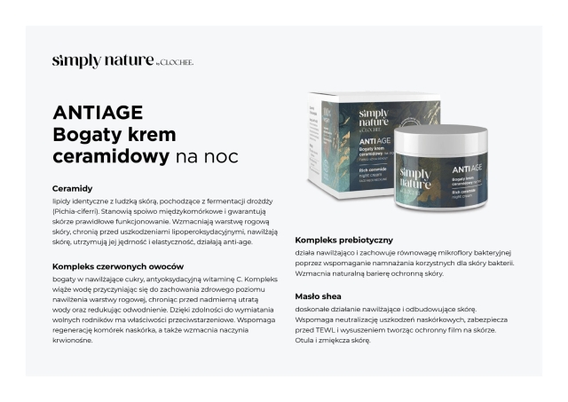 Regenerująca nocna pielęgnacja dla skóry, która potrzebuje głębokiego odżywienia i wzmocnienia. Clochee Simply Nature Rich Ceramide Night Cream to intensywnie działający krem z ceramidami, który wspiera naturalne procesy odbudowy zachodzące w skórze podczas snu.