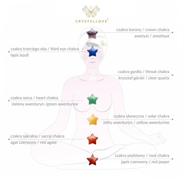 Sercem współczesnej terapii kryształami jest równoważenie czakr – ośrodków energetycznych które znajdują się na naszym ciele. Jeżeli działanie czakr zostanie zablokowane wówczas przepływ życiodajnej energii qi zostaje zaburzony a nasze samopoczucie ulega pogorszeniu. Zestaw kamieni energetycznych składa się z 7 głównych minerałów oszlifowanych na kształt gwiazdek, które mając zdolność do pochłaniania i skupiania energii wspomagają leczenie zablokowanych kanałów i ośrodków energetycznych przywracając tym samym prawidłowy przepływ energii. Kamienie energetyczne 7 czakr marki CRYSTALLOVE przeznaczone są do stymulacji punktów energetycznych (ośrodków energii) znajdujących się na naszym ciele czyli tzw. czakr. 7 głównych czakr znajduje się wzdłuż osi naszego ciała – od podstawy kręgosłupa do korony głowy a ich lokalizacja odpowiada pozycjom i funkcjom gruczołów układu endokrynologicznego oraz lokalizacjom zwojów nerwowych rozmieszczonych wzdłuż kręgosłupa. Kamienie mają zbawienny wpływ na ośrodki energetyczne naszego organizmu, powodując wzrost energii życiowej qi, wzrost potencjału intelektualnego. Jeżeli czakry wykazują znaczne odchylenia od równowagi powodując nasze gorsze samopoczucie, a swobodny przepływ życiodajnej energii qi przez te ośrodki jest zablokowany, wówczas terapia naturalna zaleca odblokowanie czakr. Kładąc odpowiednie kryształy bezpośrednio na czakrach sprawiamy że energia skupiona przez kryształy dociera do miejsc w naszym ciele, w których jest w danej chwili najbardziej potrzebna. Wg medycyny naturalnej przykładanie kryształów na czakry może zapobiegać chorobom i leczyć je. Według medycyny naturalnej każdy kamień posiada także inne, nadzwyczajne właściwości, z których warto korzystać. Sprawdź który kamień pasuje do Ciebie!