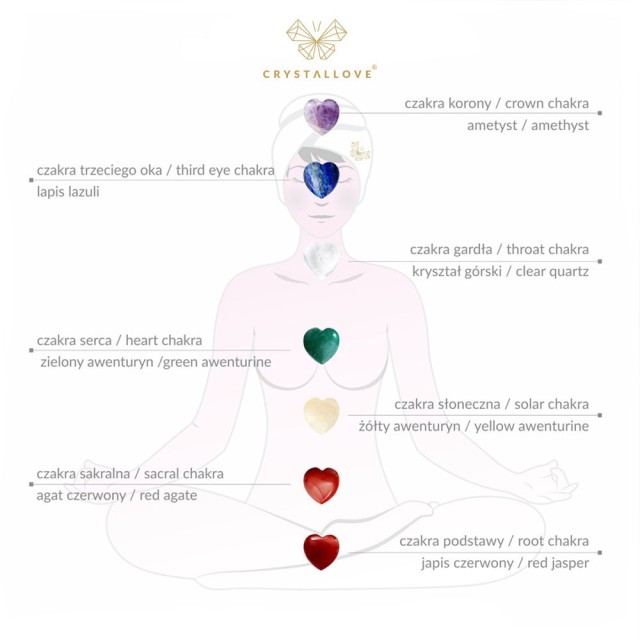 Sercem współczesnej terapii kryształami jest równoważenie czakr – ośrodków energetycznych które znajdują się na naszym ciele. Jeżeli działanie czakr zostanie zablokowane wówczas przepływ życiodajnej energii qi zostaje zaburzony a nasze samopoczucie ulega pogorszeniu. Zestaw kamieni energetycznych składa się z 7 głównych minerałów oszlifowanych na kształt gwiazdek, które mając zdolność do pochłaniania i skupiania energii wspomagają leczenie zablokowanych kanałów i ośrodków energetycznych przywracając tym samym prawidłowy przepływ energii. Kamienie energetyczne 7 czakr marki CRYSTALLOVE przeznaczone są do stymulacji punktów energetycznych (ośrodków energii) znajdujących się na naszym ciele czyli tzw. czakr. 7 głównych czakr znajduje się wzdłuż osi naszego ciała – od podstawy kręgosłupa do korony głowy a ich lokalizacja odpowiada pozycjom i funkcjom gruczołów układu endokrynologicznego oraz lokalizacjom zwojów nerwowych rozmieszczonych wzdłuż kręgosłupa. Kamienie mają zbawienny wpływ na ośrodki energetyczne naszego organizmu, powodując wzrost energii życiowej qi, wzrost potencjału intelektualnego. Jeżeli czakry wykazują znaczne odchylenia od równowagi powodując nasze gorsze samopoczucie, a swobodny przepływ życiodajnej energii qi przez te ośrodki jest zablokowany, wówczas terapia naturalna zaleca odblokowanie czakr. Kładąc odpowiednie kryształy bezpośrednio na czakrach sprawiamy że energia skupiona przez kryształy dociera do miejsc w naszym ciele, w których jest w danej chwili najbardziej potrzebna. Wg medycyny naturalnej przykładanie kryształów na czakry może zapobiegać chorobom i leczyć je. Według medycyny naturalnej każdy kamień posiada także inne, nadzwyczajne właściwości, z których warto korzystać. Sprawdź który kamień pasuje do Ciebie!