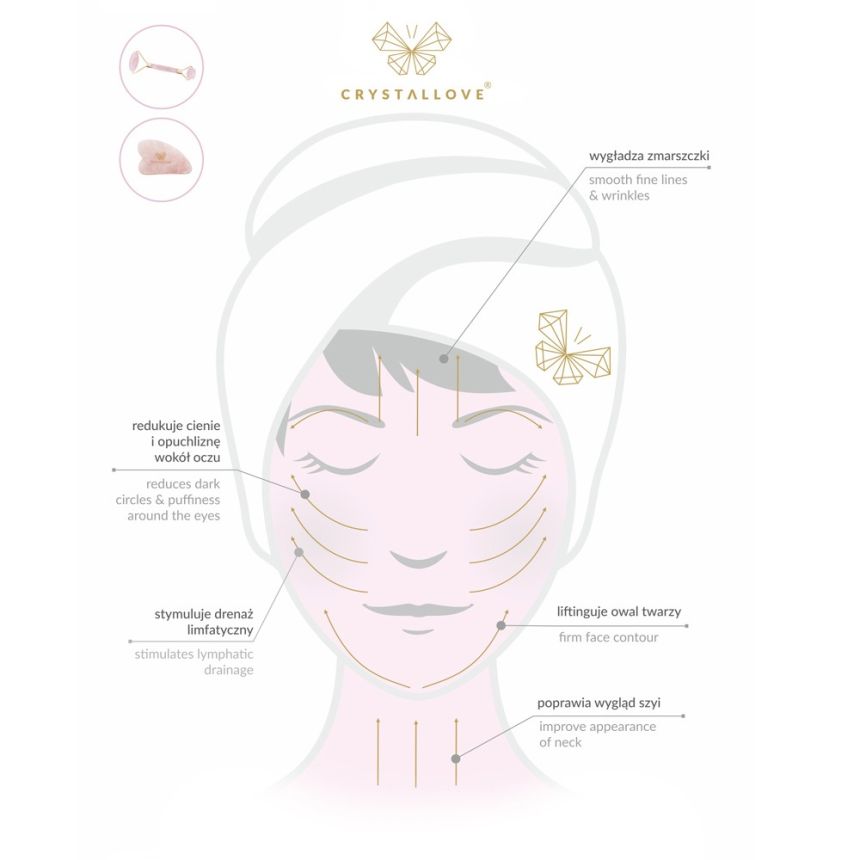 Stwórz swój własny rytuał pielęgnacyjny w domowym zaciszu za pomocą luksusowych produktów marki CRYSTALLOVE Z zestawem Rose Quartz home SPA set twoja codzienna rutyna pielęgnacyjna zamieni się w prawdziwy rytuał SPA! Za pomocą rollera do masażu twarzy wykonanego z kwarcu różowego, Twoja skóra będzie wyglądać świeżo i promiennie, zniknie opuchlizna oraz poprawi się kontur i owal twarzy! Opaska na oczy do spania wykonana z jedwabiu zarówno na zewnątrz jak i wewnątrz sprawi że skóra wokół oczu będzie zawsze wypoczęta i nawilżona! Zadba o Twoją skórę nawet wtedy kiedy śpisz! Dzięki Jedwabnym scrunchies twoje włosy będą nie tylko przepięknie wyglądały ale także nigdy więcej nie będą poplątane i łamliwe! Rose quartz home SPA set jest przeznaczony dla każdego typu cery.