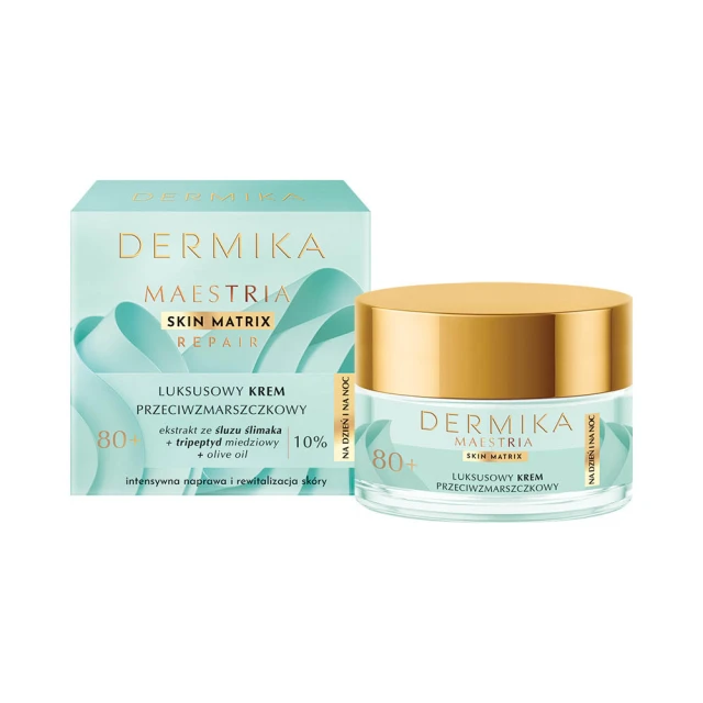 Dermika MAESTRIA to linia luksusowych kosmetyków przeciwzmarszczkowych, bogatych w składniki cenione w kosmetologii, takie jak czysty, filtrowany ekstrakt ze śluzu ślimaka, ultra skuteczny tripeptyd miedziowy oraz drogocenne oleje, które mają na celu zapewnić cerze dojrzałej maksymalną naprawę i odbudowę.