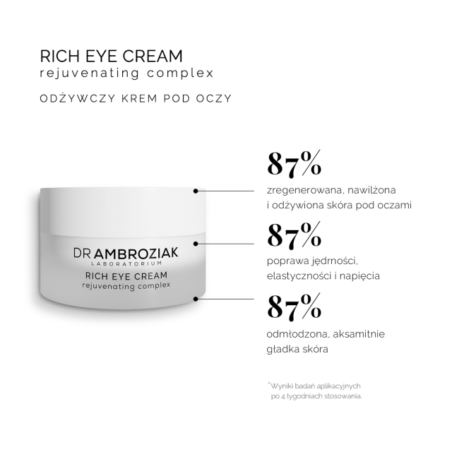 Zaufaj Rich Eye Cream Dr Ambroziak Laboratorium i ciesz się zdrową, nawilżoną oraz odmłodzoną skórą wokół oczu każdego dnia. Poczuj różnicę, jaką nasz intensywnie regenerujący krem może dokonać w pielęgnacji Twojej skóry. Teraz możesz cieszyć się pełnym zaufaniem i pięknym wyglądem, prezentując swoje oczy z pewnością i blaskiem.