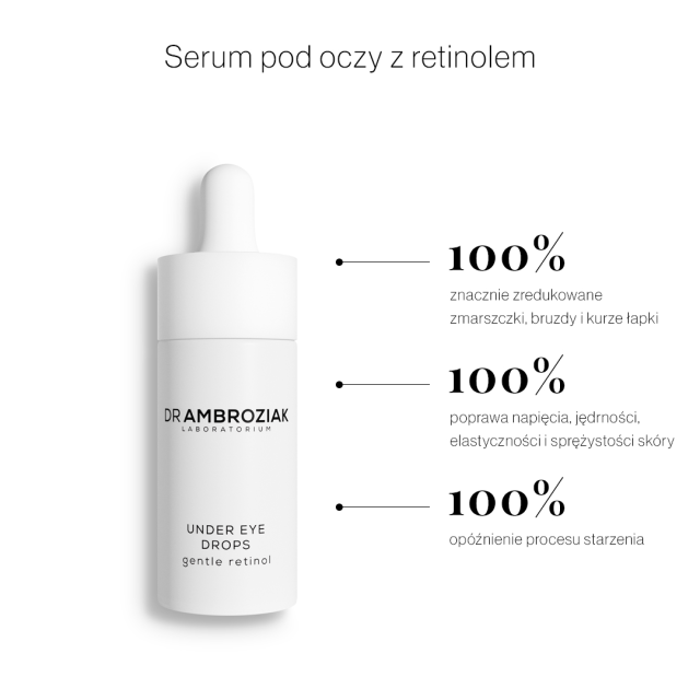 Sprawdź, jak wiele może zmienić kropla serum pod oczy z retinolem - Under Eye Drops Dr Ambroziak Laboratorium. To specjalistyczne serum skutecznie poprawia stan skóry w okolicach oczu, niweluje zmarszczki, a także, dzięki idealnie dobranym składnikom z retinolem, odbudowuje strukturę skóry i wpływa na jej odnowę komórkową.