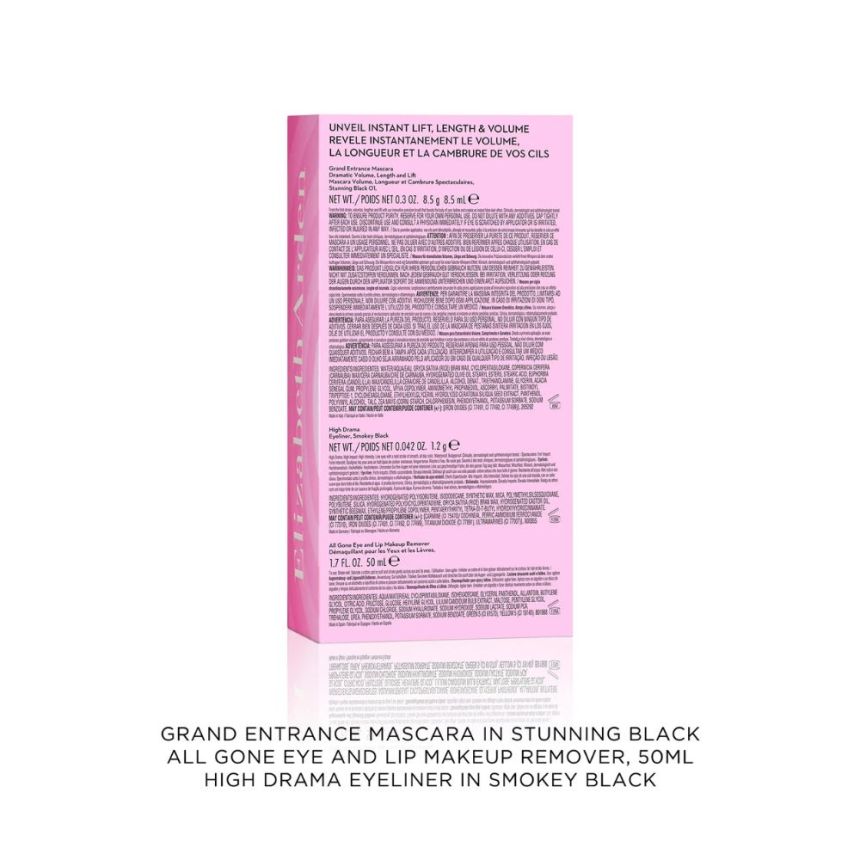 Grand Entrance Mascara: Water/Aqua/Eau, Oryza Sativa (Rice) Bran Wax, Cyclopentasiloxane, Copernicia Cerifera (Carnauba) Wax/Cera Carnauba/Cire De Carnauba, Hydrogenated Olive Oil Stearyl Esters, Stearic Acid, Euphorbia Cerifera (Candelilla) Wax/Candelilla Cera/Cire De Candelilla, Alcohol Denat., Triethanolamine, Glycerin, Acacia Senegal Gum, Propylene Glycol, Vp/Va Copolymer, Aminomethyl Propanediol, Ascorbyl Palmitate, Biotinoyl Tripeptide-1, Cyclohexasiloxane, Ethylhexylglycerin, Hydrolyzed Ceratonia Siliqua Seed Extract, Panthenol, Polyvinyl Alcohol, Talc, Zea Mays (Corn) Starch, Chlorphenesin, Phenoxyethanol, Potassium Sorbate, Sodium Benzoate [May Contain/Peut Contenir (+/-) Iron Oxides (Ci 77491, Ci 77492, Ci 77499)