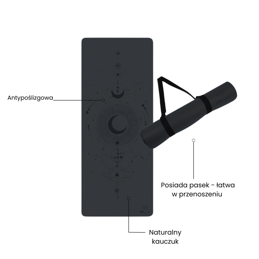 Odkryj niezwykłą matę do jogi Fit. me Księżyc, stworzoną z myślą o osobach, które pragną połączyć funkcjonalność, estetykę i głęboki spokój podczas praktyki. Wykonana z wysokiej jakości kauczuku i poliuretanu, zachwyca nie tylko swoją trwałością i stabilnością, ale także mistycznym wzorem księżyca, który symbolizuje równowagę, transformację i wewnętrzną harmonię.