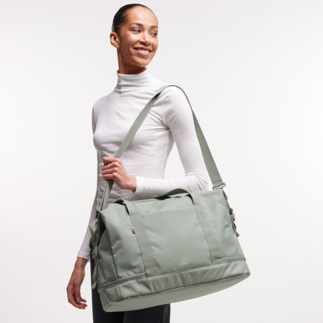 Weekend Bag wyposażona jest w dwa długie uchwyty do noszenia w ręku oraz odpinany, regulowany pasek na ramię, co daje swobodę noszenia. Boczne paski kompresyjne umożliwiają zmniejszenie objętości torby, gdy nie jest w pełni zapakowana.