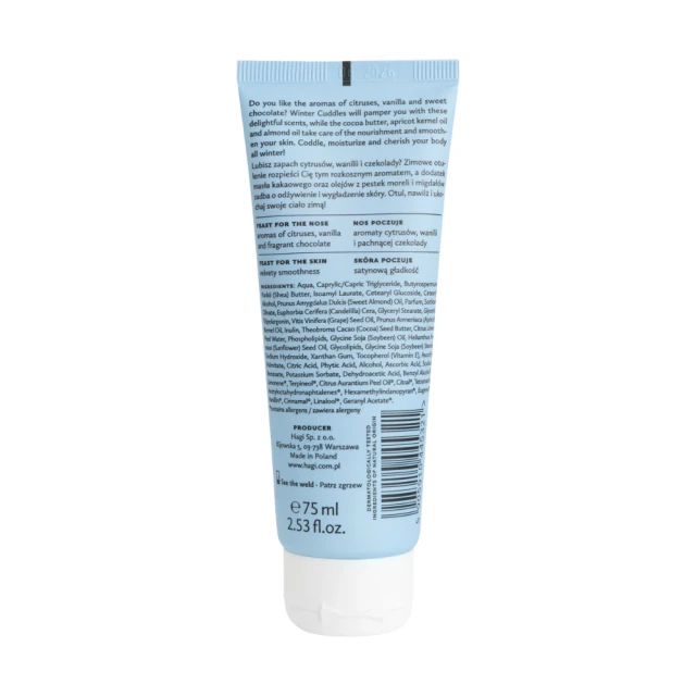 Dodatkowo, podczas aplikacji kosmetyku, otula Cię słodki zapach czekolady i wanilii, który pozostaje na skórze na długo, przynosząc przyjemność i uczucie ciepła w chłodne, zimowe dni.