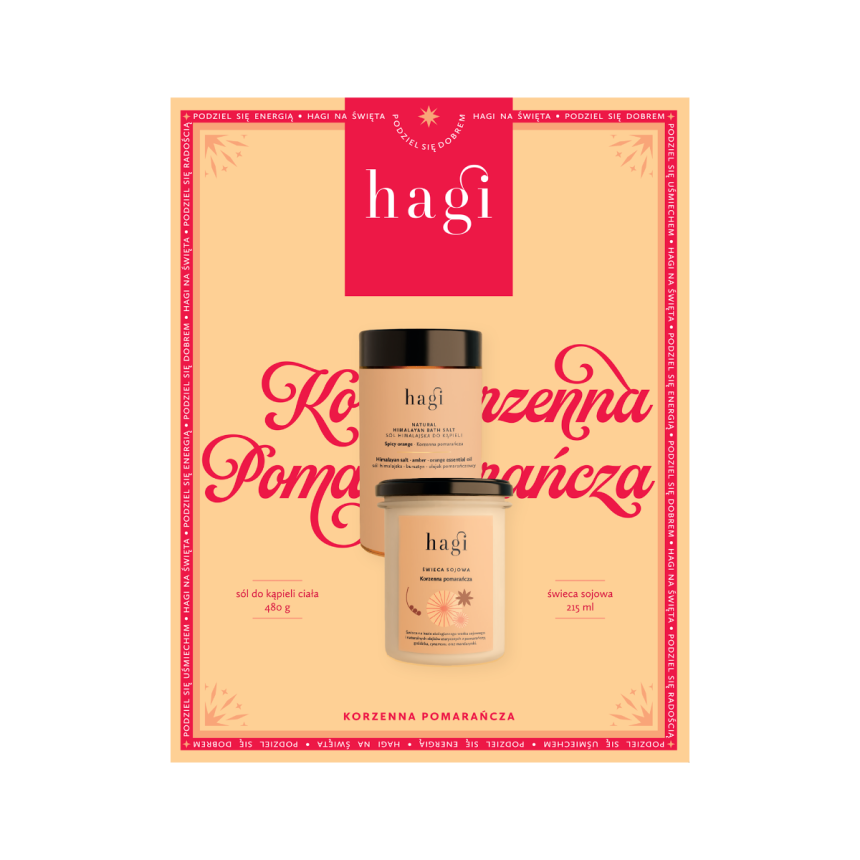 Hagi Zestaw Korzenna Pomarańcza to wyjątkowa propozycja prezentowa dla miłośników relaksu i aromatycznych kąpieli. W zestawie znajdziesz sól do kąpieli oraz świecę sojową z bestsellerowej linii Korzenna Pomarańcza. Ich ciepły, cytrusowo-korzenny zapach łączy soczystą pomarańczę, cynamon i miód, tworząc atmosferę przytulności i odprężenia.