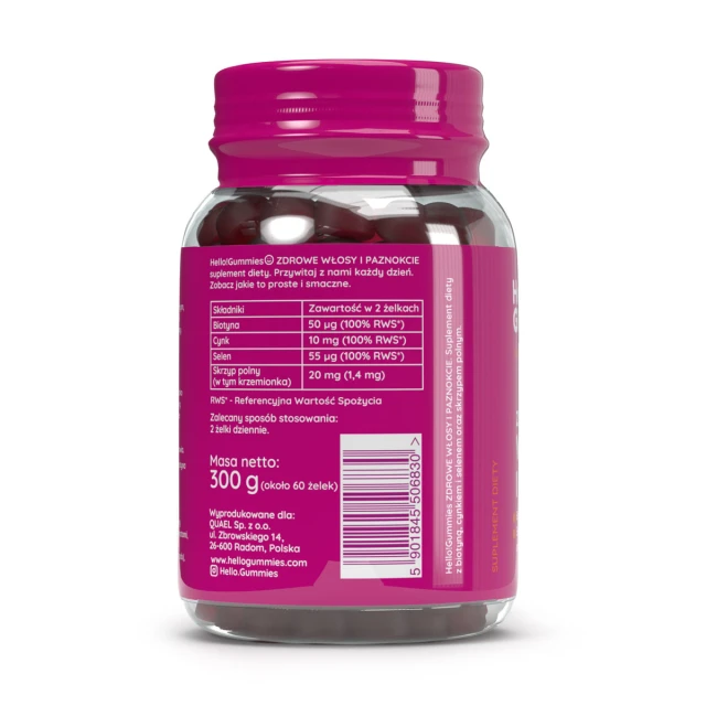 syrop glukozowy, cukier, woda, żelatyna wieprzowa, regulator kwasowości - kwas cytrynowy, ekstrakt ze skrzypu polnego (w tym krzemionka) , mieszanka witaminowo-mineralna (cytrynian cynku, selenian (VI) sodu, D-biotyna), stabilizator - sorbitole, olej roślinny słonecznikowy, barwnik - koncentrat soku z czarnej marchwi, aromat malinowy naturalny z innymi aromatami naturalnymi , substancja glazurująca - wosk carnauba.