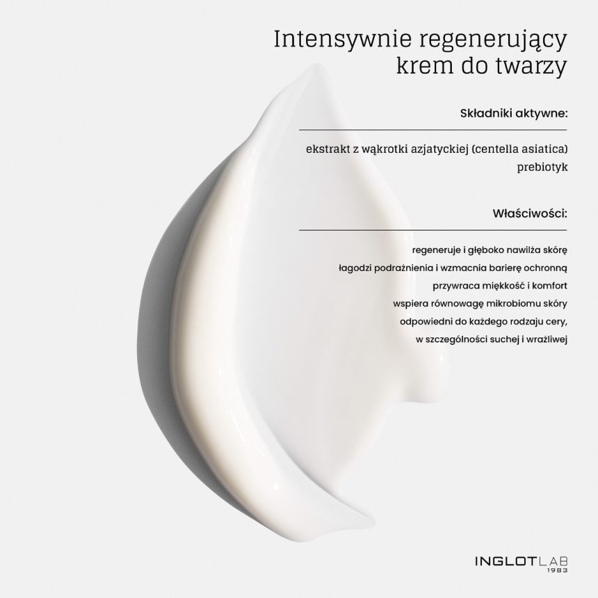 Inglot LAB Intensely Regenerating Face Cream to krem lipidowy o intensywnie regenerującej formule, w którym aż 95% składników pochodzi z natury. Ma aksamitną konsystencję, szybko się wchłania i nie zostawia tłustego filmu. Zapewnia uczucie miękkości i ukojenia już po pierwszym użyciu, a przy regularnej aplikacji poprawia jędrność, elastyczność i wygładza drobne zmarszczki.