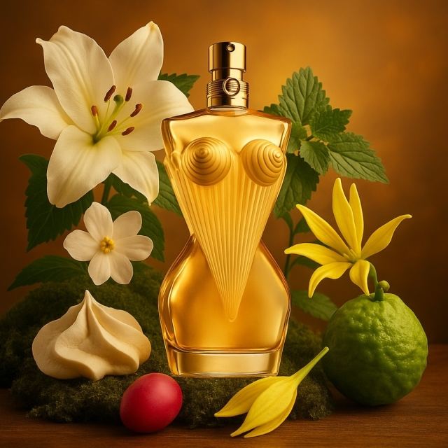Woda perfumowana Gaultier Divine pod niebiańskim flakonem w kształcie sylwetki łączy złożoność ludzkiej natury z tęsknym idealizmem. Równoważąc nuty kwiatowe z ziemistą bazą, otwiera się niebiańskimi zapachami lilii i jaśminu, po czym osiada w paczuli i piżmie, pozostawiając uczucie, jakby świat był naprawdę na wyciągnięcie ręki.