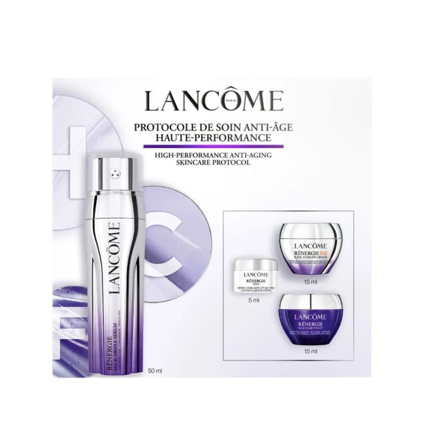 Lancôme Rénergie H. C.F. Triple Serum Routine Se t to zaawansowany zestaw pielęgnacyjny, który odpowiada na potrzeby skóry dojrzałej oraz wymagającej regeneracji. Dzięki połączeniu nowoczesnych składników aktywnych wspiera poprawę jędrności, wygładzenie zmarszczek oraz wyrównanie kolorytu skóry. To kompleksowa rutyna, która pomaga przywrócić skórze młodszy, bardziej promienny wygląd.
