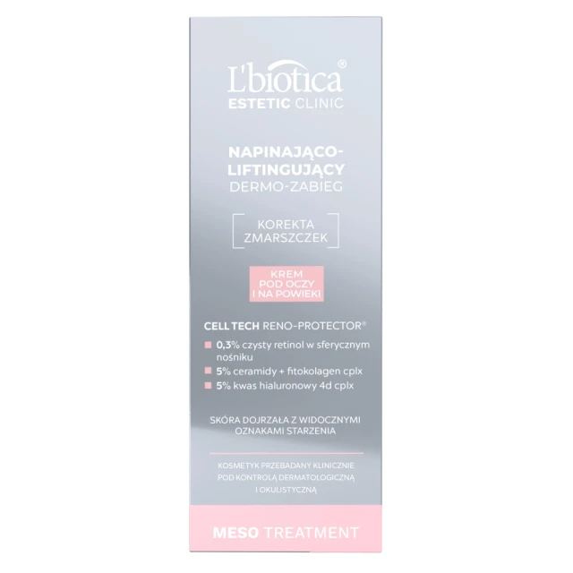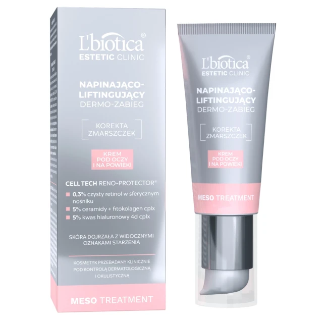 Krem Napinająco-Liftingujący Dermo-Zabieg to nowoczesne rozwiązanie dla skóry wokół oczu. Wykorzystuje zaawansowaną technologię Cell Tech Reno-Protector® i retinol, skutecznie redukujące zmarszczki. Dzięki opóźnionej emisji składników aktywnych, głęboko penetruje skórę, stymulując produkcję kolagenu. Zmniejsza zmarszczki, redukuje kurze łapki i poprawia kontur oka. Daje efekt jędrności i nawilżenia, zmniejszając oznaki zmęczenia i dodając zdrowego blasku.