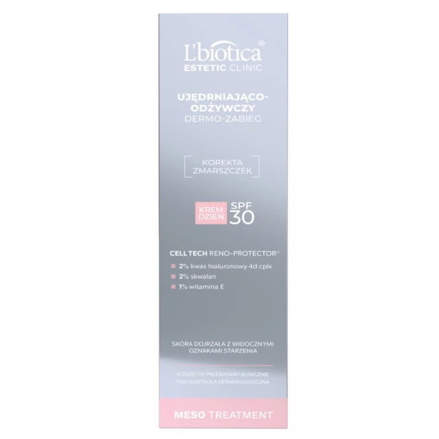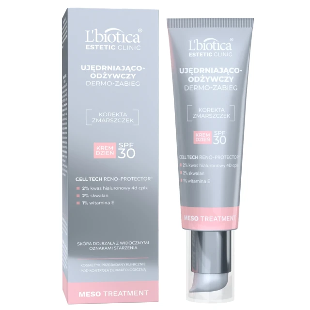 Krem Ujędrniająco-Odżywczy Dermo-Zabieg z filtrem SPF 30 to bogaty krem do stosowania na dzień, wykorzystujący innowacyjną technologię Cell Tech Reno-Protector® i optymalne stężenie kwasu hialuronowego w czterech formach. Dzięki różnym wielkościom cząsteczek, skutecznie nawilża i wypełnia zmarszczki od wewnątrz, nadając skórze gładkość. Formuła intensywnie odżywia i nawilża, przynosząc widoczny efekt liftingu, wygładzenia i poprawy napięcia skóry. Z regularnym stosowaniem skóra staje się bardziej elastyczna, dobrze nawilżona, a zmarszczki mniej widoczne.