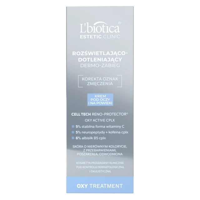 Krem Rozświetlająco-Dotleniający Dermo-Zabieg to lekka formuła do pielęgnacji powiek i okolic oczu, idealna na dzień i noc. Wykorzystuje innowacyjną technologię Cell Tech Reno-Protector® oraz optymalne stężenie witaminy C o potwierdzonej skuteczności antyoksydacyjnej. Stabilna forma witaminy C działa intensywnie na głębsze warstwy skóry, rozjaśniając przebarwienia i stymulując syntezę kolagenu. Dodatkowo, kompleks OXY ACTIVE CPLX redukuje oznaki zmęczenia, poprawiając napięcie i nawilżenie skóry. Z czasem skóra staje się młodsza, wygładzona i ujędrniona, a zmarszczki mimiczne oraz kurze łapki ulegają spłyceniu.