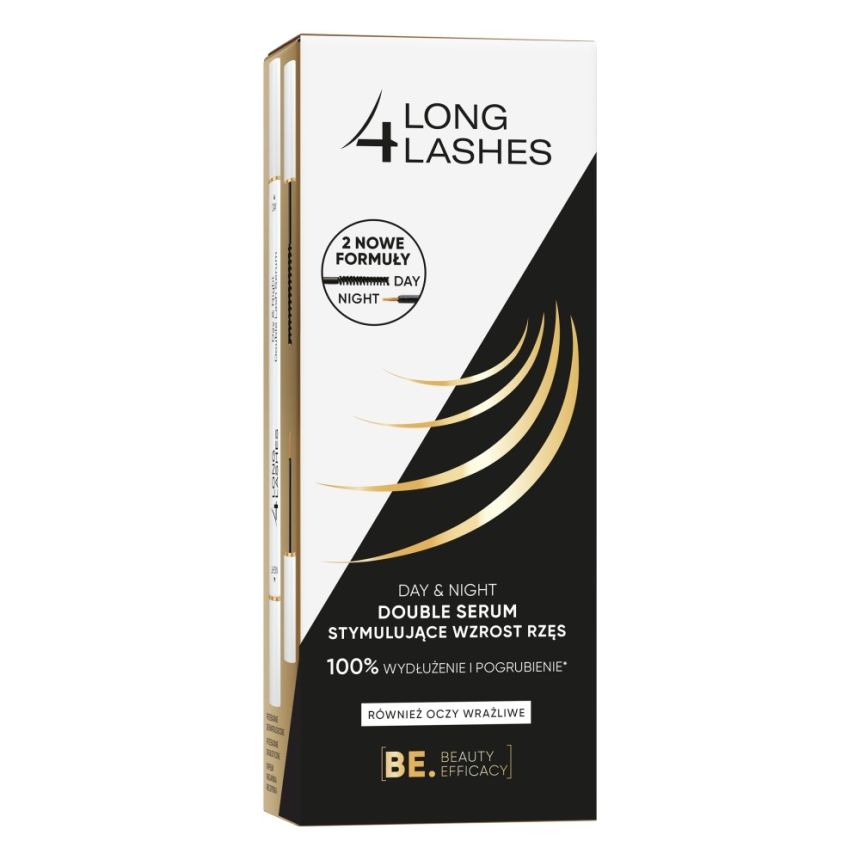 Long4Lashes Day&Night Double Serum stymulujące wzrost rzęs to kompleksowa pielęgnacja rzęs w dwóch etapach – dzień i noc. Dwie oddzielne formuły w osobnych buteleczkach działają w synergii: nocne serum przyspiesza wzrost rzęs, a dzienne odżywia, wzmacnia i chroni włoski, zapewniając maksymalny efekt gęstszych, dłuższych i mocniejszych rzęs.
