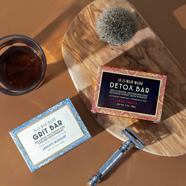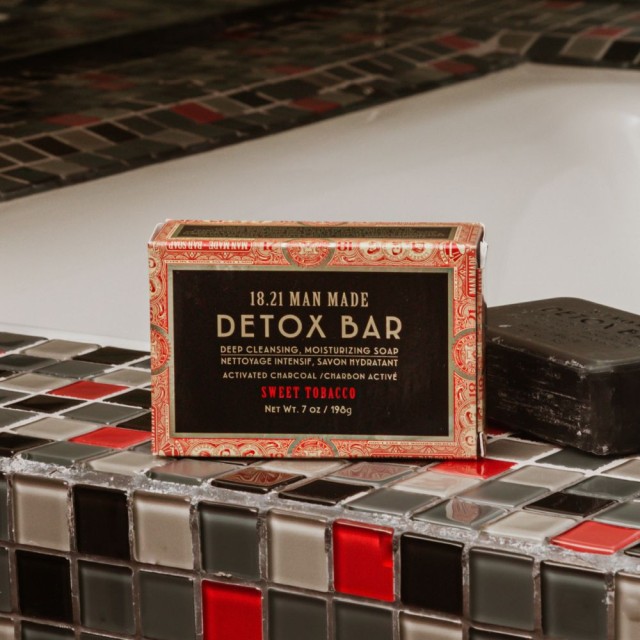 18. 21 Man Made Detox Bar Soap Sweet Tobacco to detoksykująco-nawilżające mydło w kostce zawierające aktywny węgiel, który pomaga w usuwaniu zanieczyszczeń i nadmiaru sebum z powierzchni skóry, co jest szczególnie ważne dla osób z problematyczną lub trądzikową skórą.