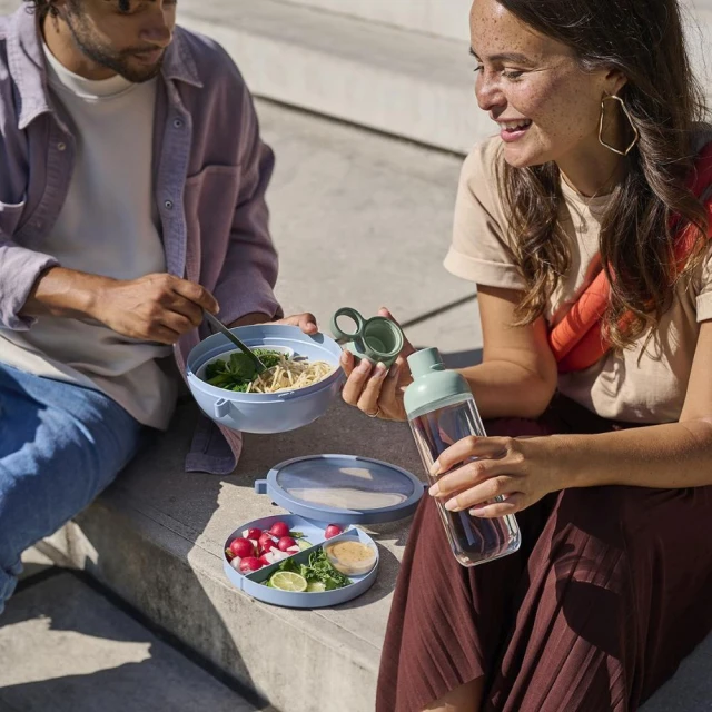 Miska Vita wyposażona jest w dwa wyjmowane pojemniki Bento oraz tackę, które pomagają oddzielać różne składniki, oferując łącznie aż pięć przegródek. To świetne rozwiązanie, gdy chcesz zjeść sałatkę z dressingiem, ale zależy Ci, aby składniki pozostały świeże i chrupiące aż do momentu podania. Zakręcana pokrywa zapewnia pełną szczelność, więc nie musisz się martwić o wycieki podczas transportu, a jedzenie zachowa swój naturalny aromat.