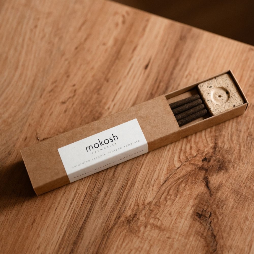 Zestaw naturalnych kadzideł MOKOSH Mleczna Wanilia i Pomarańcza to połączenie słodkiej, kremowej nuty z cytrusową świeżością. Zapach jest łagodny, ale wyraźny, przyjemnie otula i tworzy ciepłą atmosferę w domu. Każdy patyczek powstaje ręcznie w małej manufakturze, wyłącznie z roślinnych składników: żywic, ziół, kwiatów, proszków drzewnych i olejku eterycznego z pomarańczy. Dzięki temu kadzidła palą się równomiernie, dając subtelniejszy aromat i mniej dymu niż klasyczne odpowiedniki.