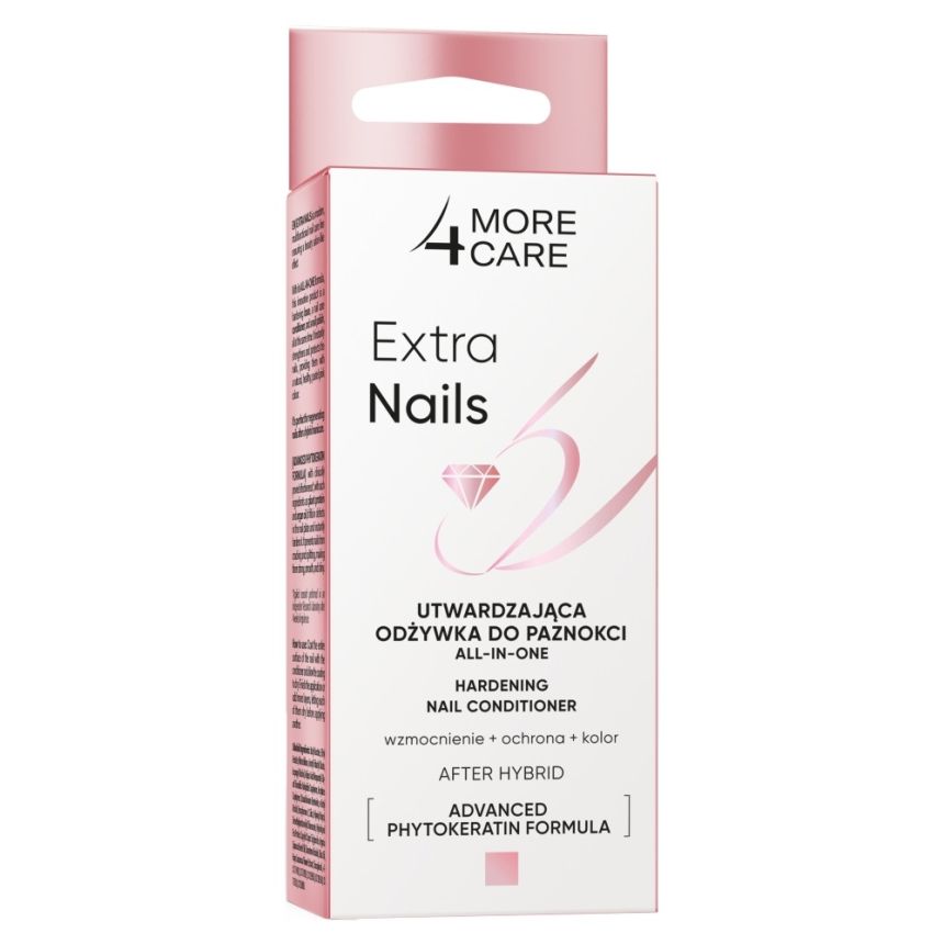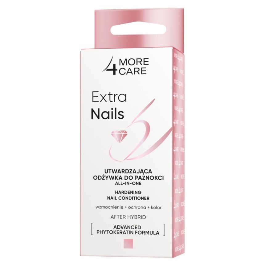 More4Care Extra Nails Utwardzająca odżywka do paznokc i to element nowoczesnej linii pielęgnacyjnej, która zapewnia efekt zadbanych paznokci jak po profesjonalnym zabiegu. Innowacyjna formuła ALL-IN-ONE łączy w sobie funkcję utwardzającej bazy, pielęgnacyjnej odżywki i delikatnego lakieru.
