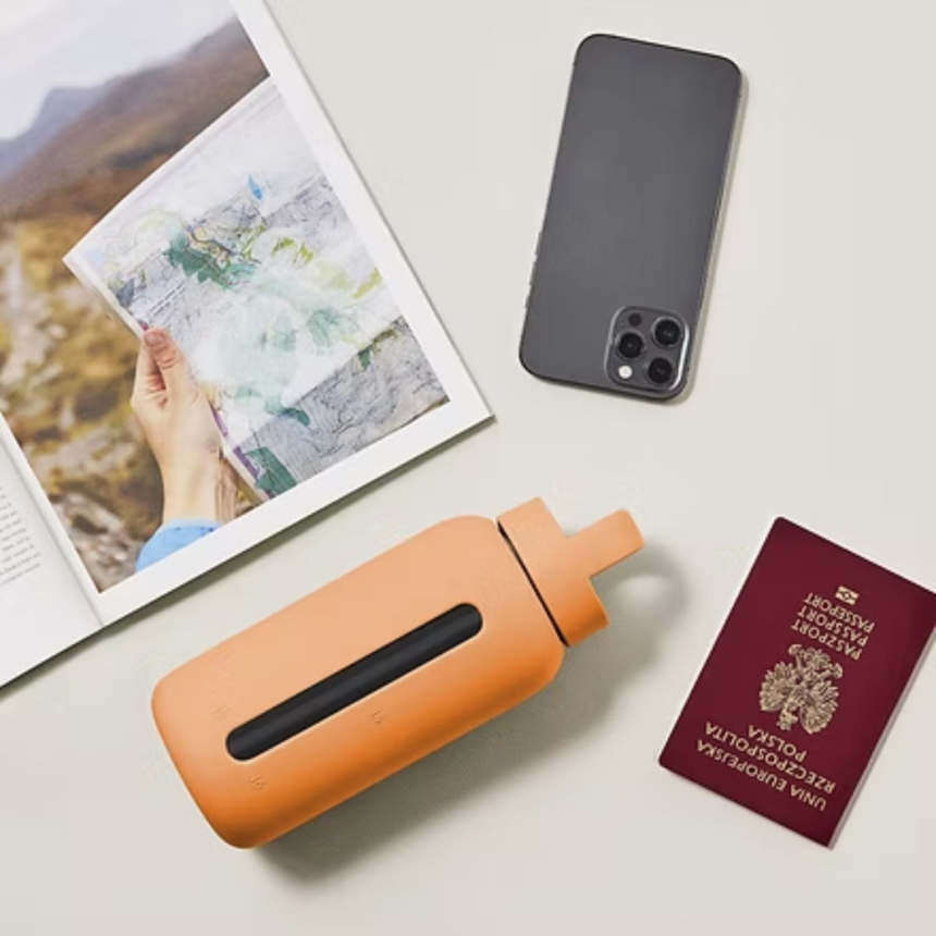 Butelka została zaprojektowana z myślą o wygodzie użytkowania. Szeroka szyjka (4, 9 cm) ułatwia napełnianie i czyszczenie, a silikonowy rękaw chroni szkło przed uszkodzeniem i zapewnia pewny chwyt. Praktyczny uchwyt sprawia, że butelkę można wygodnie przenosić, a szczelna zakrętka gwarantuje brak przecieków, nawet w torbie.