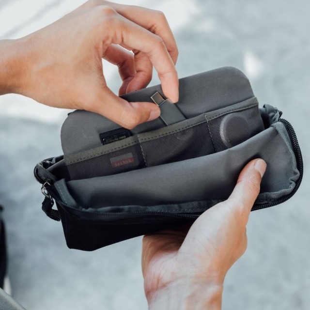 Dzięki modułowemu wnętrzu bez trudu uporządkujesz ładowarki, słuchawki, kable, powerbanki i inne akcesoria. Składana przegroda pozwala na tworzenie mniejszych przegródek lub zwolnienie miejsca na większe przedmioty. Dodatkowa zewnętrzna kieszeń z przepustem na kabel umożliwia ładowanie urządzeń bez konieczności wyjmowania ich z etui.