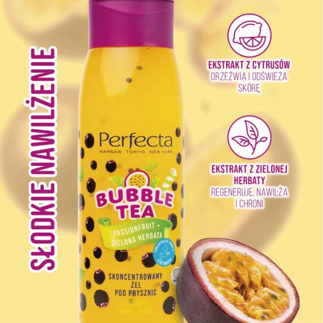 Odkryj unikalny, owocowy żel pod prysznic Perfecta Bubble Tea z ekstraktem z zielonej herbaty i owocową nutą. Poczuj delikatną, kremową pianę na swojej skórze. Dodatkowe nawilżenie zapewnią Ci hydrożelowe kuleczki, które rozcierają się podczas mycia! Świeży, orzeźwiający zapach uprzyjemni chwile relaksu w czasie kąpieli. Wegańska formuła.