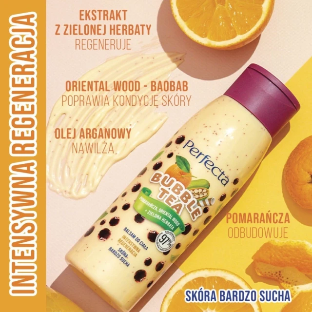 Hej! Na pewno znasz pyszne napoje owocowo-herbaciane Bubble Tea. Jestem balsamem do ciała inspirowanym tymi wyjątkowymi napojami. Zawieram ekstrakt z zielonej herbaty, a wyciągi z pomarańczy i baobabu (oriental wood) doskonale uzupełniają tę zaskakującą kompozycję. Największą niespodzianką będą dla Ciebie witaminowe kuleczki, które mam w sobie! Podczas nakładania zapewnią Twojej skórze witaminowe odżywienie. Sprawdź sama, jak działam na Twoją skórę! Potrafię ją zregenerować i nawilżyć, a moim sprzymierzeńcem jest olej arganowy zawarty w mojej formule. Zdradzę Ci jeszcze, że cudownie pachnę! Wypróbuj mnie koniecznie!