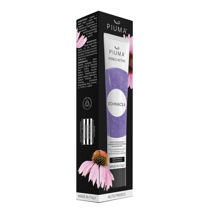 Piuma Visible Active Echinacea to pasta do zębów stworzona z myślą o skutecznej ochronie jamy ustnej i codziennym komforcie. Jej formuła została wzbogacona o ekstrakt z jeżówki, znanej ze swoich właściwości przeciwzapalnych i antybakteryjnych. Dzięki temu pasta pomaga ograniczać rozwój bakterii odpowiedzialnych za nieświeży oddech oraz wspiera zdrowie dziąseł.