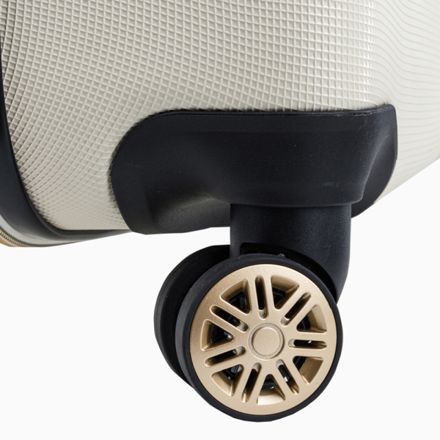 Cztery podwójne kółka obracające się o 360° zapewniają płynne prowadzenie walizki w każdym kierunku. Dwustopniowy stelaż z regulacją wysokości w kolorze dopasowanym do bryły umożliwia wygodne manewrowanie. W zależności od rozmiaru walizki dostępne są uchwyty: w modelu kabinowym – górny, w większych – również boczny oraz ochronne nóżki pozwalające na bezpieczne ustawienie na boku.