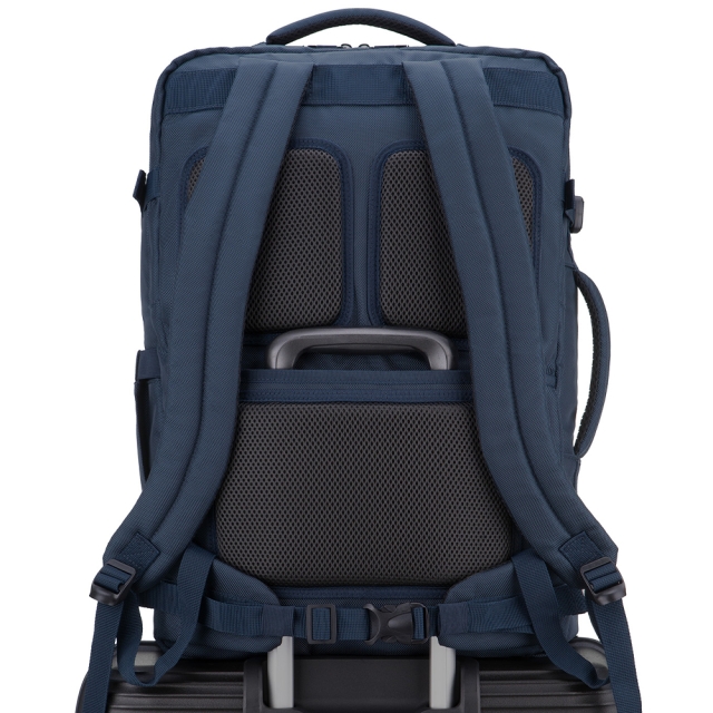 Dodatkowa taśma na plecach umożliwia stabilne mocowanie plecaka na stelażu walizki – co zwiększa komfort w czasie podróży.