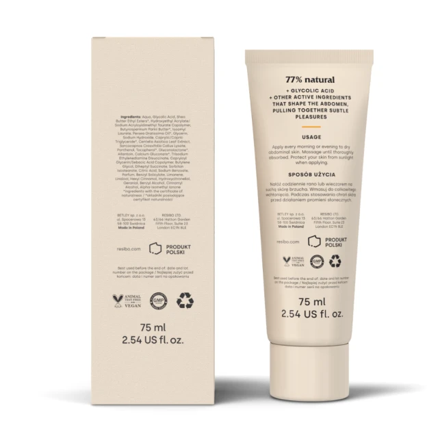 Resibo ABS Shaper Specialized Abdomen Shaping Cream to zaawansowany krem do modelowania brzucha, który łączy skuteczność składników aktywnych z przyjemnością masażu. Jego lekka, łatwa w aplikacji konsystencja sprawia, że pielęgnacja staje się codziennym rytuałem. Krem nie tylko ujędrnia skórę, ale także wspomaga redukcję tkanki tłuszczowej, pomagając uzyskać wymodelowany i jędrny brzuch.