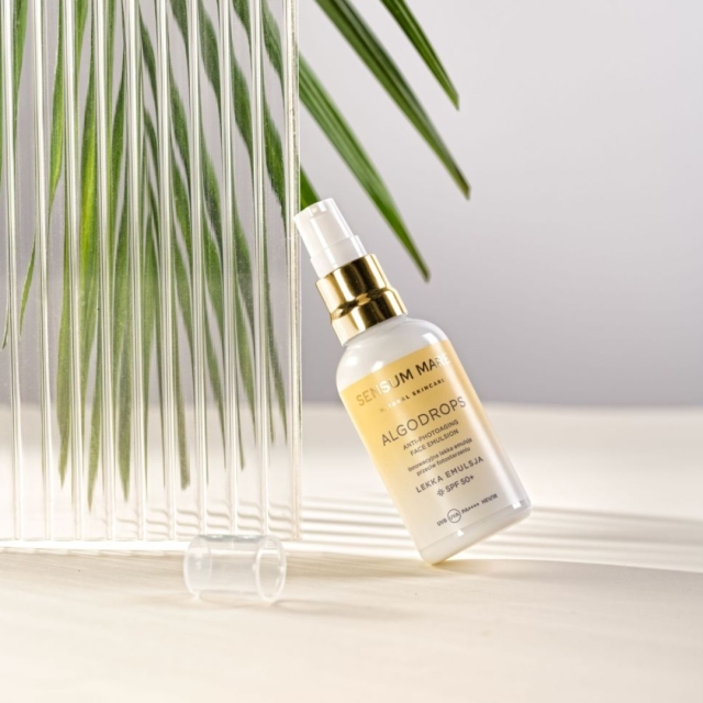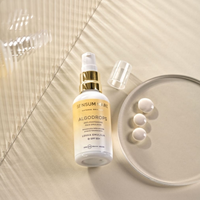 Potęga natury i osiągnięcia nauki zamknięte w nowej, niespotykanej dotąd formule, którą pokochasz. Innowacyjna lekka emulsja ochronna przeciw fotostarzeniu ALGODROPS z wysokim filtrem SPF 50 to połączenie pielęgnacyjnych właściwości serum do twarzy z kompleksową ochroną przed promieniami słonecznymi, zanieczyszczeniem oraz niebieskim i podczerwonym światłem. Wyjątkowa formuła emulsji nie obciąża skóry, nie zostawia białego filmu, dzięki temu ochrona przeciwsłoneczna staje się przyjemna i komfortowa. Emulsja sprawdzi się u osób poszukujących zaawansowanej ochrony i bogatych receptur. Innowacyjne składniki zawarte w kroplach: ELIX-IRTM oraz SAKADIKIUMTM wspomagają ochronę skóry przed szkodliwym działaniem promieniowania słonecznego UVA i UVB, niebieskim światłem, promieniami podczerwonymi i miejskimi zanieczyszczeniami. Kompleks 5 alg morskich potęguje nawilżający i pielęgnacyjny efekt dla skóry. Witamina E (tokoferol) działa jako silny przeciwutleniacz, chroni skórę przed oznakami starzenia. Woda z lodowca norweskiego, naturalnie bogata w minerały i pierwiastki śladowe, stanowi dopełnienie unikalnych składników aktywnych zawartych w kroplach.