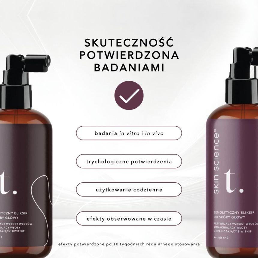 Mechanizm działania: Preparat wykazuje działanie senolityczne i antyoksydacyjne, które spowalnia procesy starzenia skóry głowy i włosów oraz stymuluje mikrokrążenie. Obniża markery starzenia, takie jak inhibitory cyklu komórkowego (p16, p19) oraz poziom białka p21. Redukuje też komórki związaną z procesem starzenia β-galaktozydazę. Preparat hamuje miniaturyzację mieszków włosowych, pobudza wzrost nowych włosów i zmniejsza liczbę włosów meszkowych. Regularne stosowanie zwiększa liczbę i gęstość włosów. Zmniejsza także liczbę siwych włosów, szczególnie u osób zestresowanych.