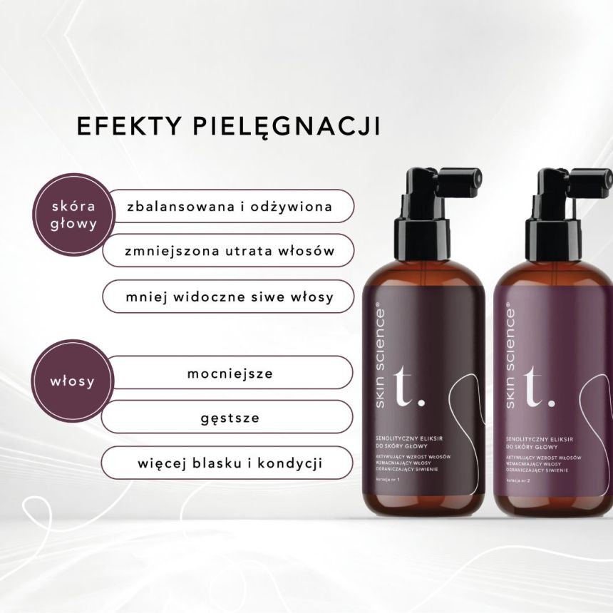 Wskazania: Serum jest przeznaczone dla osób zmagających się z wypadaniem włosów, siwieniem oraz utratą struktury włosów. Kuracja Skin ScienceR TrichologicR jest skierowana do kobiet i mężczyzn z problemami okresowego, przedwczesnego oraz nasilonego wypadania włosów, a także przedwczesnego siwienia. Stymuluje wzrost włosów przy przerzedzeniu oraz zmniejsza siwienie spowodowane przez czynniki genetyczne, hormonalne, stres, leki, niewłaściwą dietę, promieniowanie UV i zanieczyszczenia środowiska.