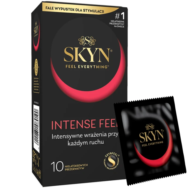 Jeszcze intensywniejsze doznania ze SKYN Intense Feel. Fale intensywnych wypustek zapewniają wyjątkową stymulację, a nielateksowy materiał SKYNFEEL naturalne odczucia.