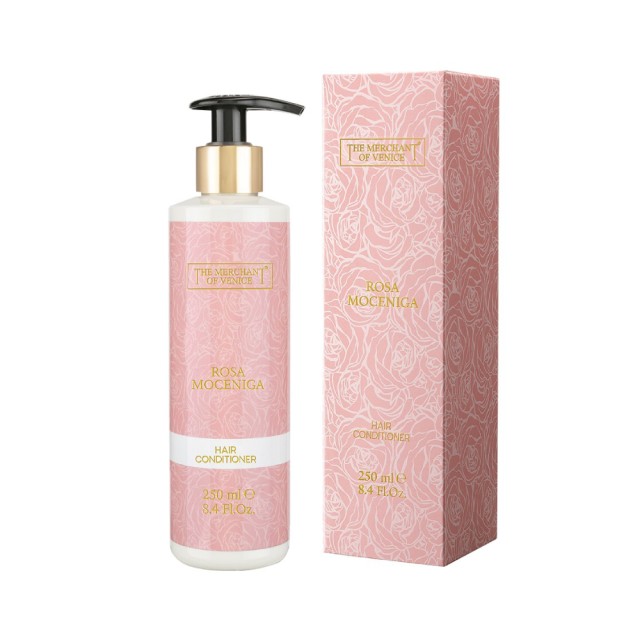 Odżywka do włosów Rosa Moceniga, zawierająca kwiatowe i słodko-owocowe nuty kultowego zapachu, otula włosy pachnącym uściskiem wzbogaconym nutami bursztynu, czyniąc je miękkimi i jedwabistymi.
