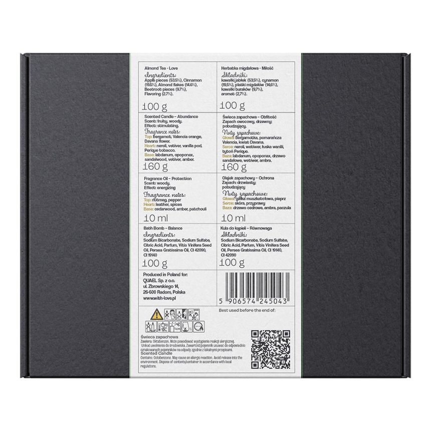 Herbatę zalej gorącą wodą i zaparz przez kilka minut, następnie wypij w spokojnej atmosferze. Roller aplikuj bezpośrednio na skórę – nadgarstki, szyję lub dekolt – i delikatnie rozprowadź. Świecę zapal w bezpiecznym miejscu i pozwól, aby wosk równomiernie się roztopił, uwalniając zapach. Kulę do kąpieli wyjmij z opakowania i wrzuć do wanny wypełnionej ciepłą wodą, a po kąpieli dokładnie spłucz ciało i wannę.