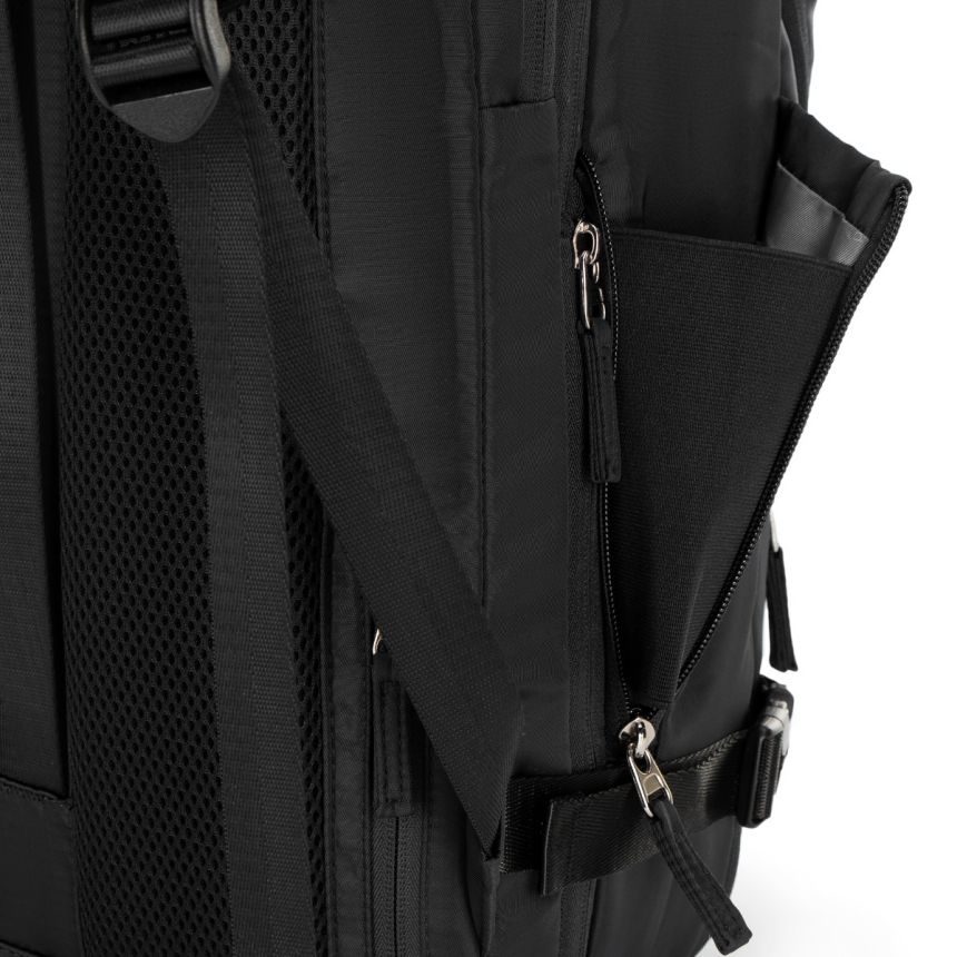 Komfort noszenia zapewniają regulowane, miękko wyściełane szelki z oddychającej siatki oraz pas piersiowy, który stabilizuje plecak w trakcie marszu. Pasy kompresyjne pozwalają dopasować objętość do aktualnych potrzeb, a pionowy pas na plecach umożliwia wygodne zamocowanie plecaka na rączce walizki. Liczne kieszenie zewnętrzne ułatwiają przechowywanie drobiazgów, a boczna kieszeń z możliwością poszerzenia pomieści większą butelkę lub termos.