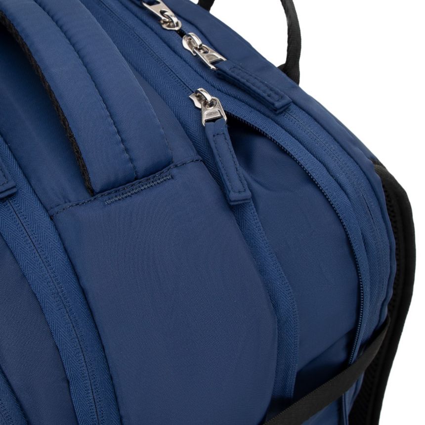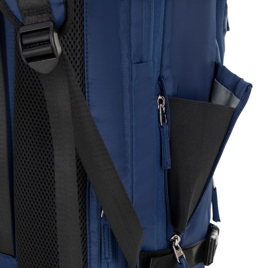 Komfort noszenia zapewniają regulowane, miękko wyściełane szelki z oddychającej siatki oraz pas piersiowy, który stabilizuje plecak w trakcie marszu. Pasy kompresyjne pozwalają dopasować objętość do aktualnych potrzeb, a pionowy pas na plecach umożliwia wygodne zamocowanie plecaka na rączce walizki. Liczne kieszenie zewnętrzne ułatwiają przechowywanie drobiazgów, a boczna kieszeń z możliwością poszerzenia pomieści większą butelkę lub termos.