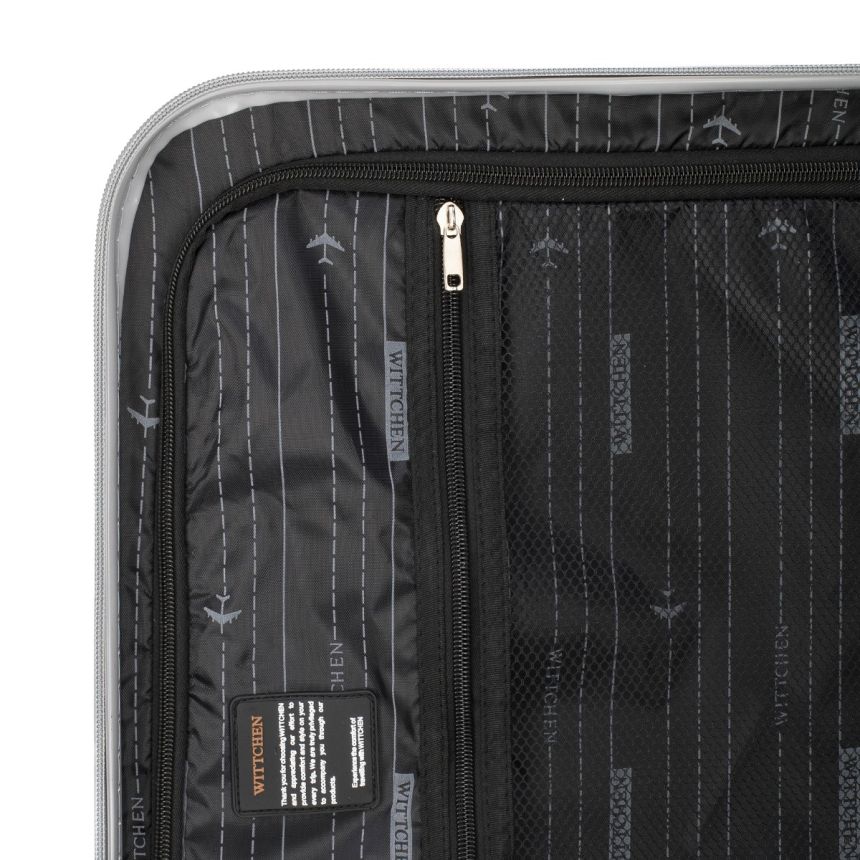 Wnętrze zostało zaplanowane tak, aby ułatwić organizację bagażu. Walizka posiada dwie komory – jedną z elastycznymi pasami, które stabilizują odzież podczas transportu, oraz drugą zapinaną na suwak, idealną na drobniejsze rzeczy. Dodatkowo w środku znajduje się kieszeń z siatki oraz niewielka kieszeń na suwak, która pozwala przechowywać najpotrzebniejsze przedmioty w jednym miejscu.
