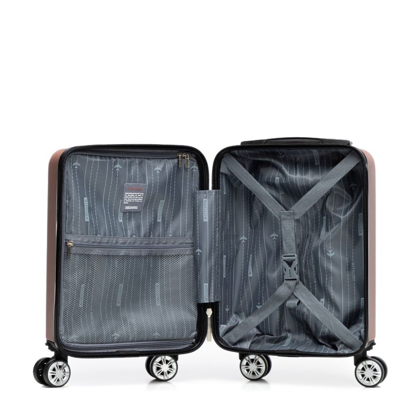 Solidna konstrukcja z ABS-u sprawia, że walizka jest jednocześnie lekka i odporna na codzienne użytkowanie. Wnętrze zostało podzielone na dwie funkcjonalne komory – główną z regulowanymi pasami stabilizującymi oraz drugą zapinaną na suwak z kieszenią z siatki. Dzięki temu łatwiej uporządkować rzeczy i szybko znaleźć najpotrzebniejsze przedmioty podczas podróży.
